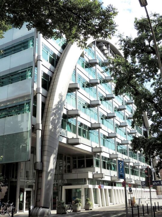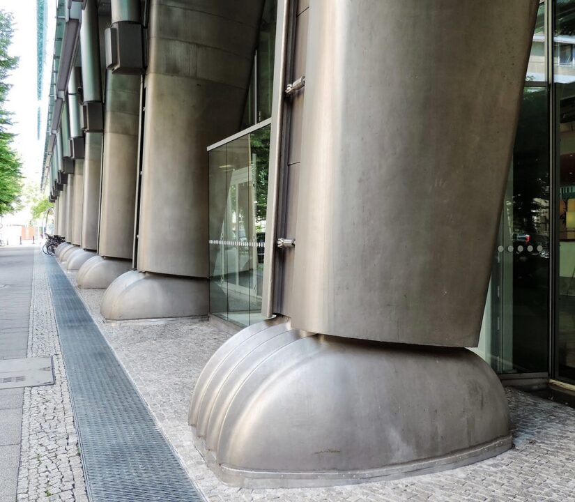 La Ludwig-Erhard-Haus, bâtiment moderne (1998), qui abrite la Chambre du commerce et de l’industrie ainsi que la Bourse de Berlin. L’architecte britannique Nicholas Grimshaw, connu, entre autres, pour avoir réalisé la gare de Waterloo à Londres, est l’auteur de ce surprenant bâtiment, dont la silhouette évoque celle d’un tatou. Des dimensions différentes ont été données aux 15 arcs qui supportent la toiture et les étages de bureaux, et ce afin d’adapter la structure au relief du terrain. (source)